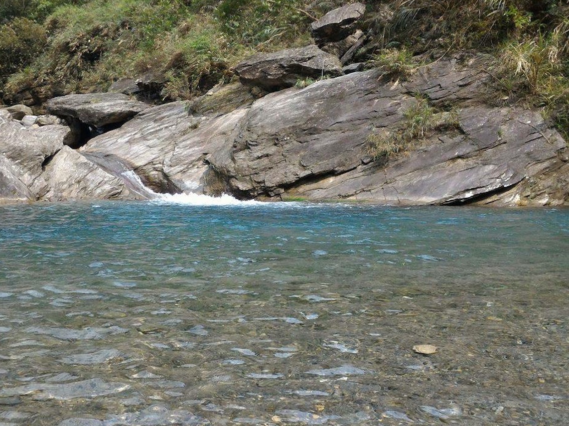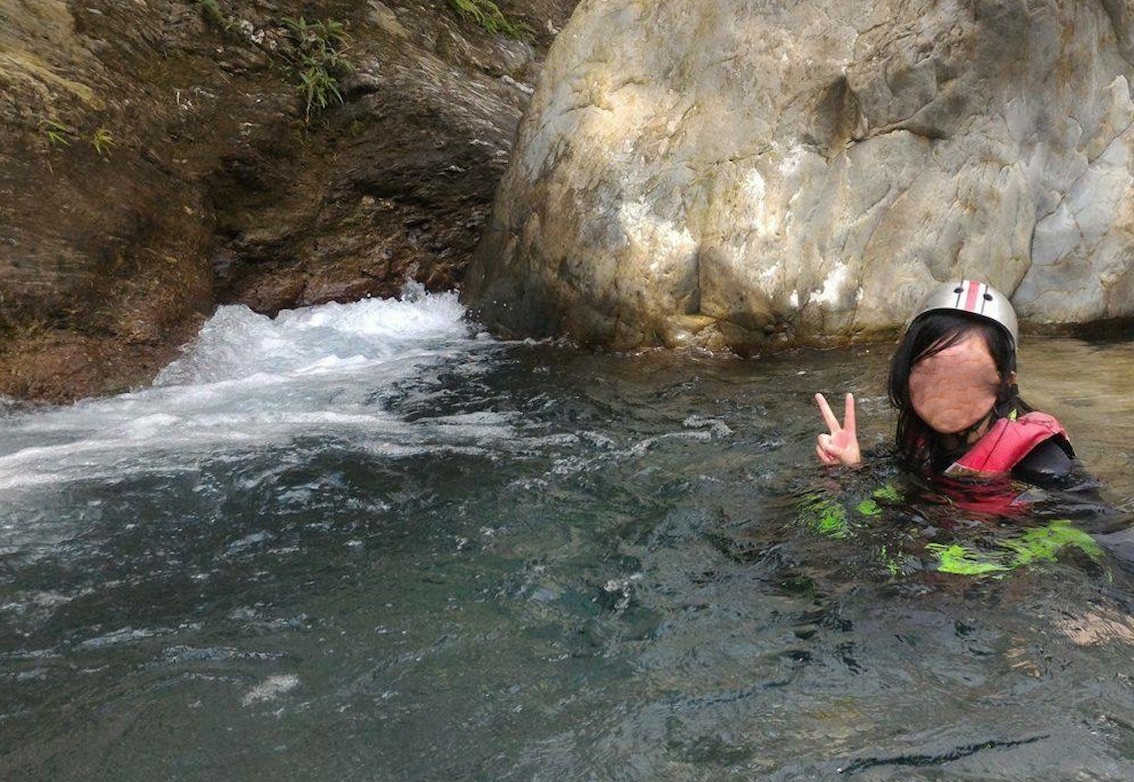 鯉魚潭吃過中飯后,這一天的重點是溯溪探險,換上潛水服,踩進清澈漂亮的水裡,攀爬石頭一路往上。潛水服是在路邊一家店租借的,有青旅認識的朋友當我的導遊(沒有人帶很危險噢)。水潭有原住民在跳水遊戲,而我則任由水流送我漂浮打轉。超有趣!